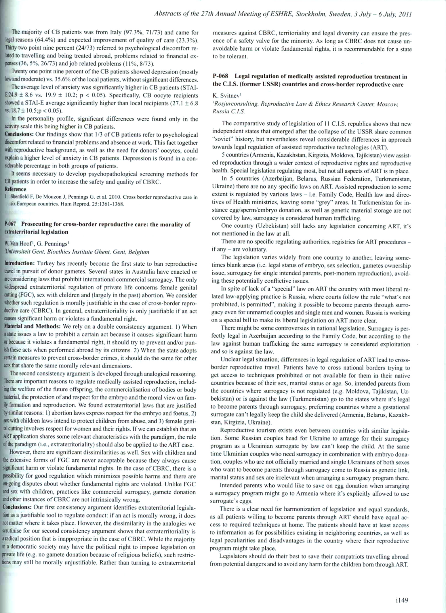 Стокгольм, 3-6 июля 2011г 27-ая ежегодная конференция Европейского общества эмбриологии и репродукции человека (ESHRE). Свитнев К.Н. (K. Svitnev) Legal Regulation of Medically Assisted Reproduction Treatment in the C.I.S. (former USSR) Countries and Cross-Border Reproductive Care.