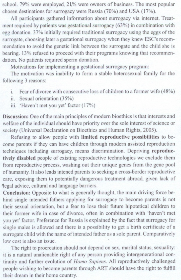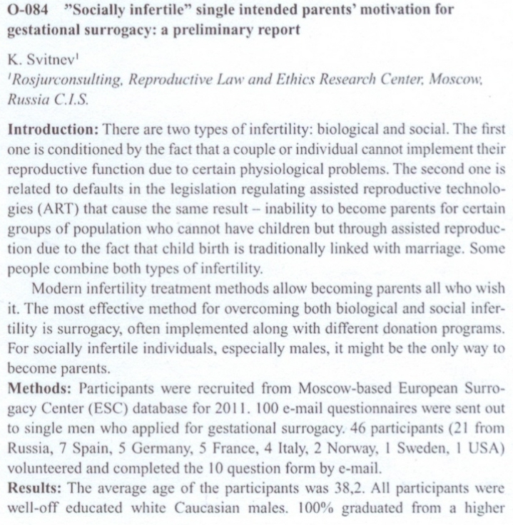 Свитнев К. Н. (K. Svitnev) "Мотивация одиноких "социально-бесплодных" людей, собирающихся стать родителями при помощи гестационного суррогатного материнства" (Socially infertile” single intended parents’ motivation for gestational surrogacy) |