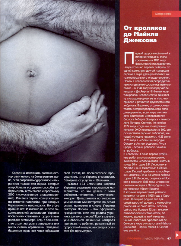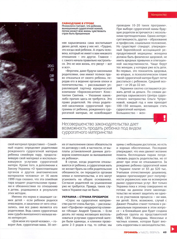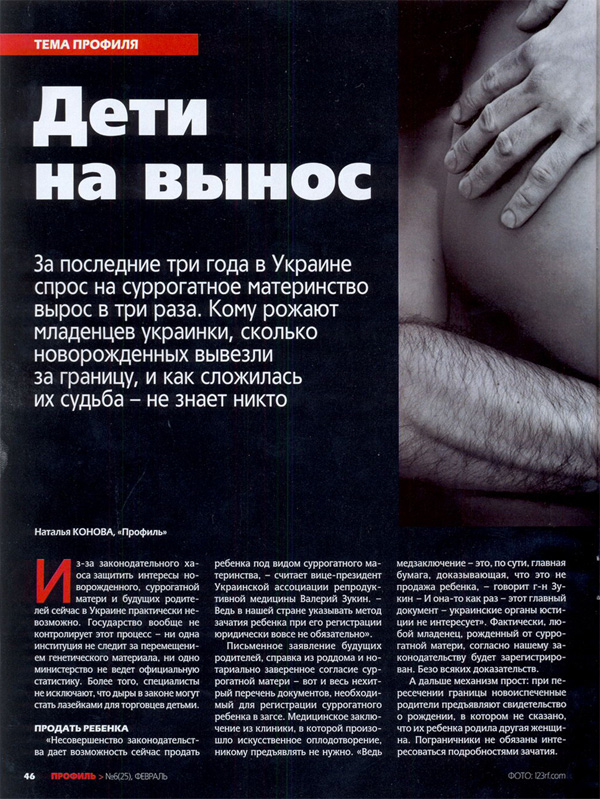 «Несовершенство законодательства дает возможность сейчас продать ребенка под видом суррогатного материнства, — считает вице-президент Украинской ассоциации репродуктивной медицины Валерий Зукин. — Ведь в нашей стране указывать метод зачатия ребенка при его регистрации юридически вовсе не обязательно».